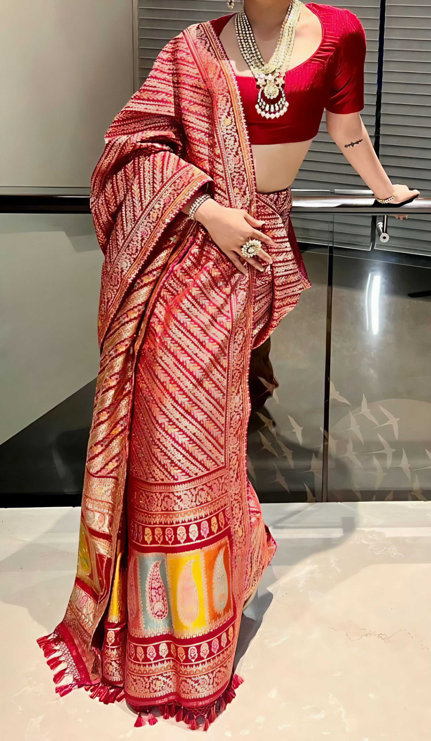 Crimson Banarasi Mashru Katan Silk Meenakari Saree