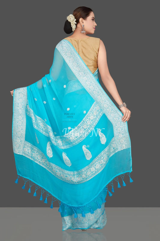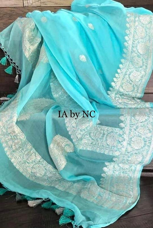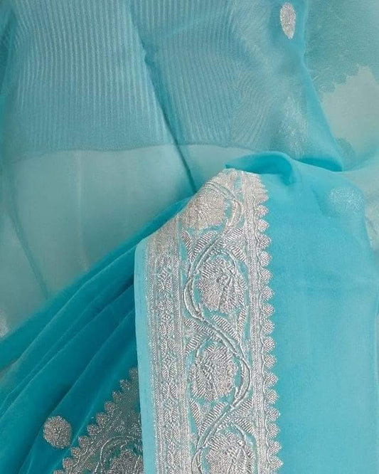 Turquoise Banarasi Pure Katan Silk Raw Mango Saree