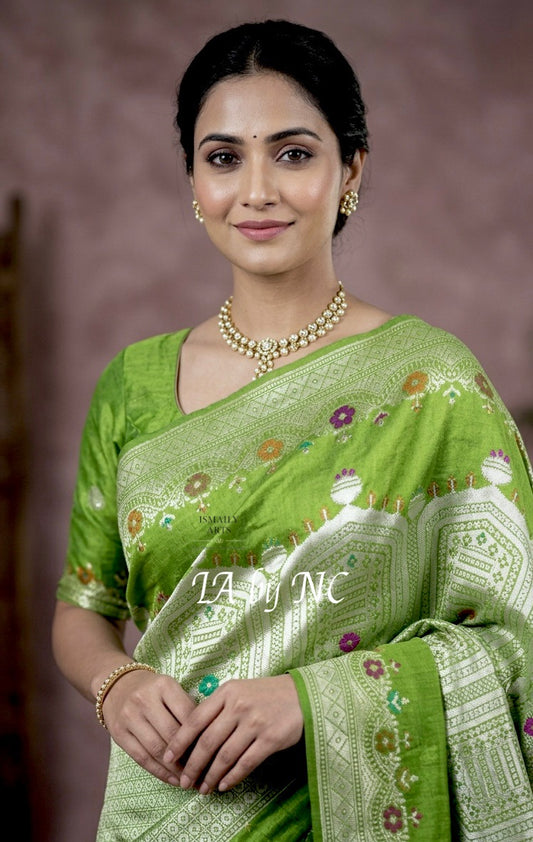 Avocado Banarasi Pure Khaddi Tussar Georgette Paithani Saree