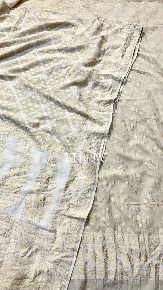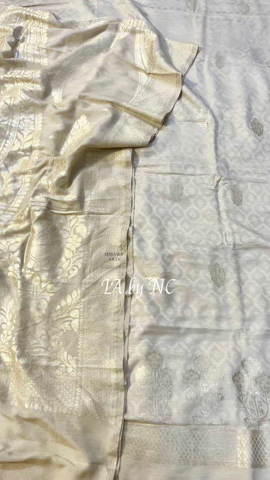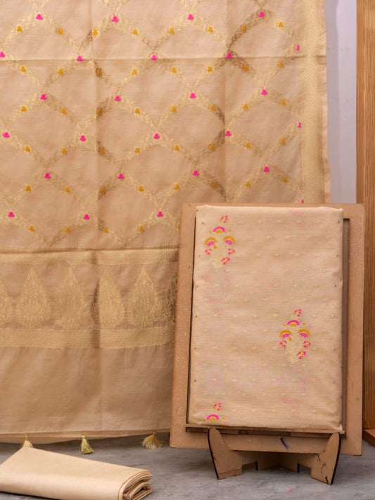 Beige Banarasi Premium Cotton Silk Jamdani Dress Materials