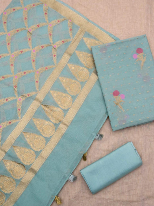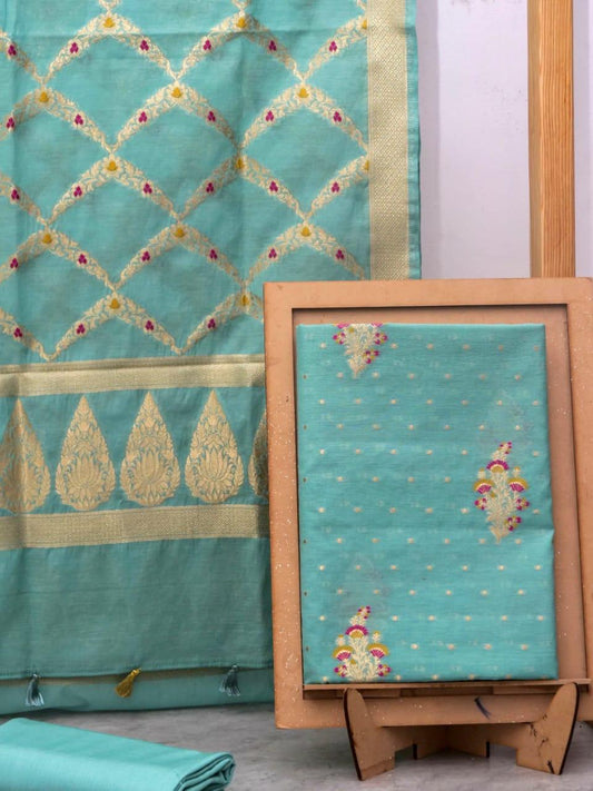 Turquoise Banarasi Premium Cotton Silk Jamdani Dress Materials