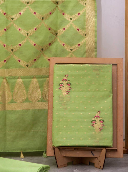Pista Banarasi Premium Cotton Silk Jamdani Dress Materials
