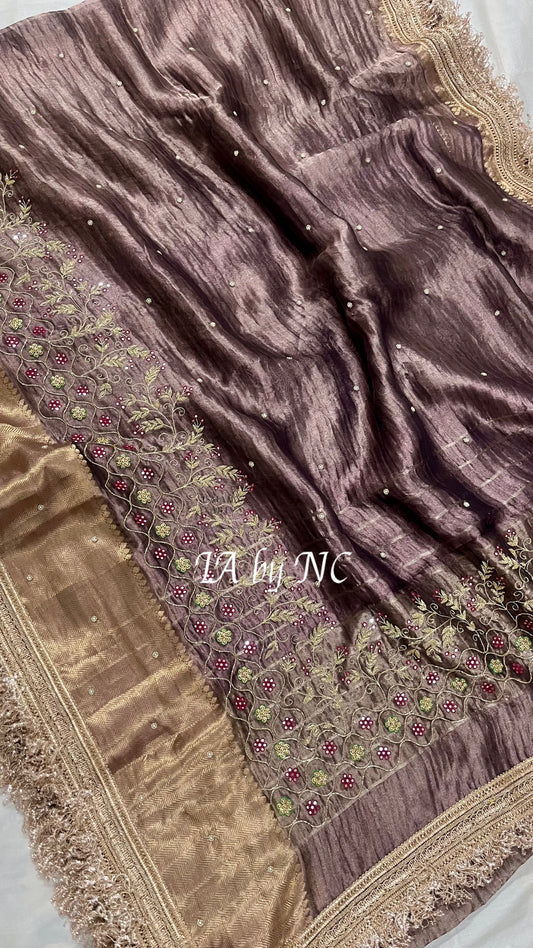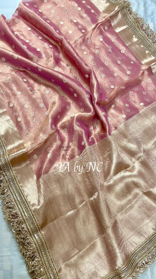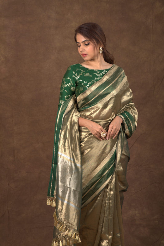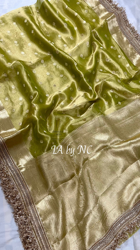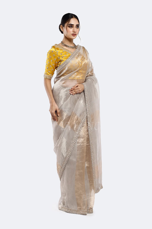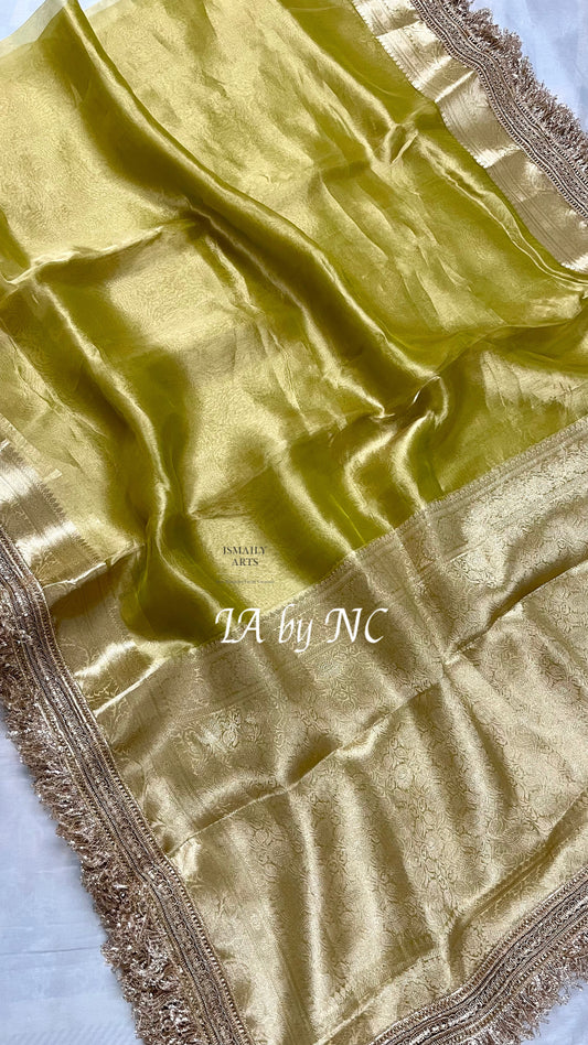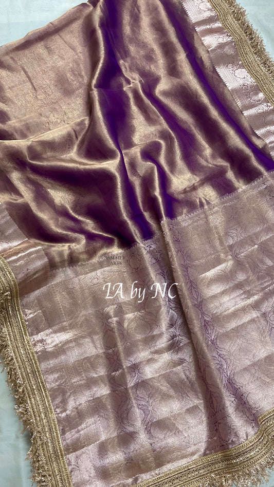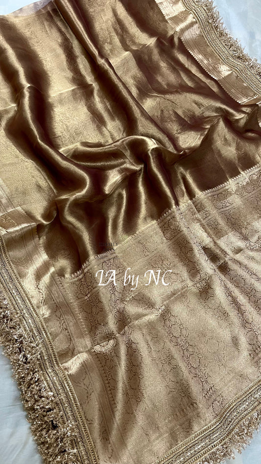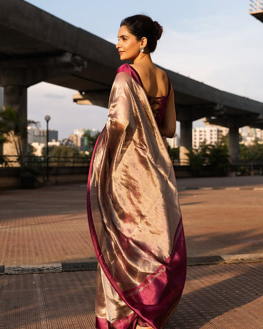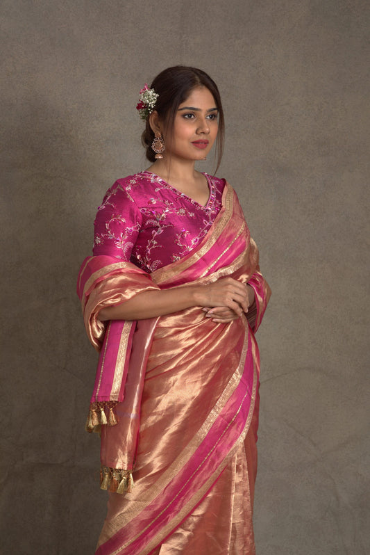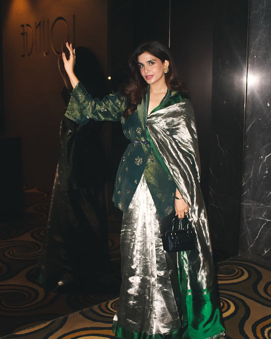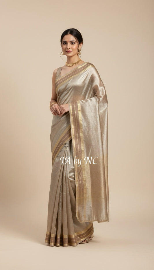 Elevate your wardrobe with our luxurious tissue sarees. Made from lightweight fabric, perfect for special occasions. With shimmering metallic yarns for added elegance, our tissue sarees are composed of silk and zari threads for a stunning look. Perfect for any fashion-forward individual.