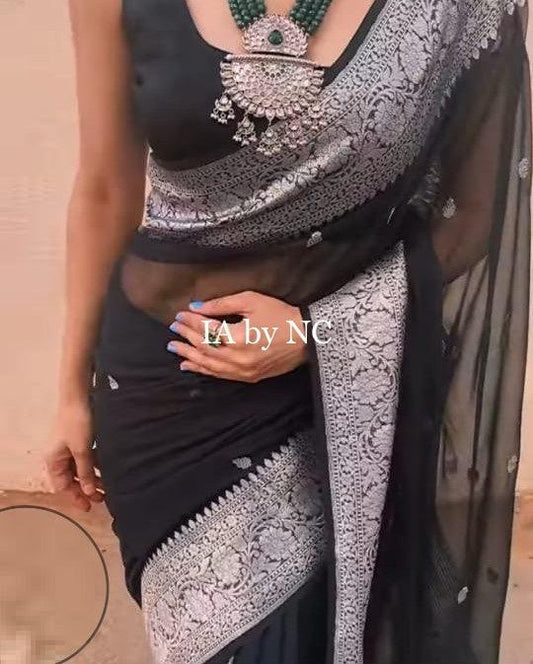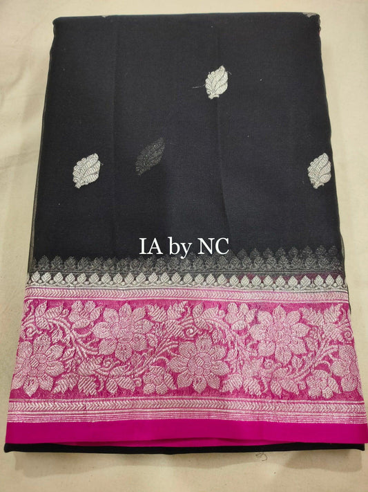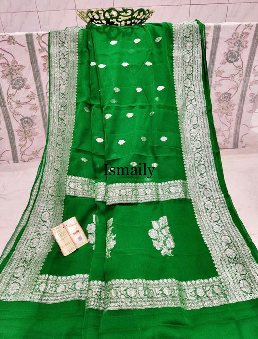 Presenting the Best Seller Khaddi Georgette of all time which defines the extreme artistic crafts of benarasi kadwa(locked) weaves in silver (Rupa) Zari.