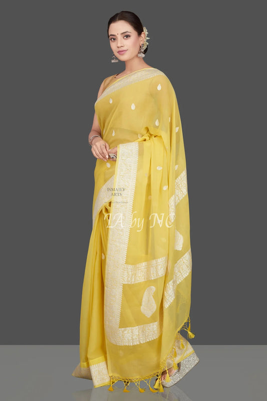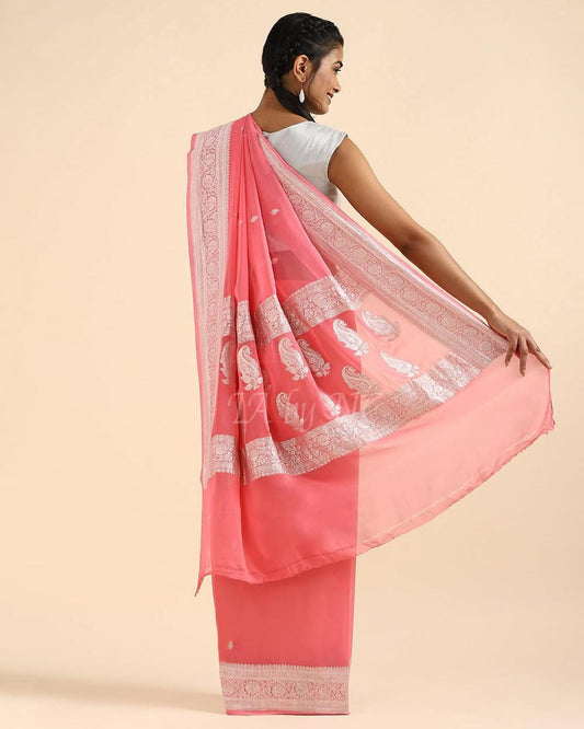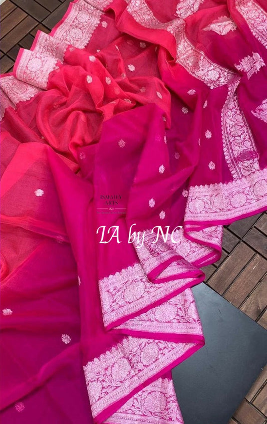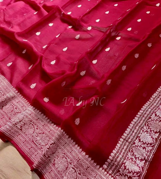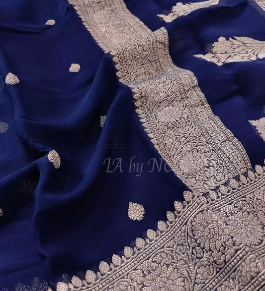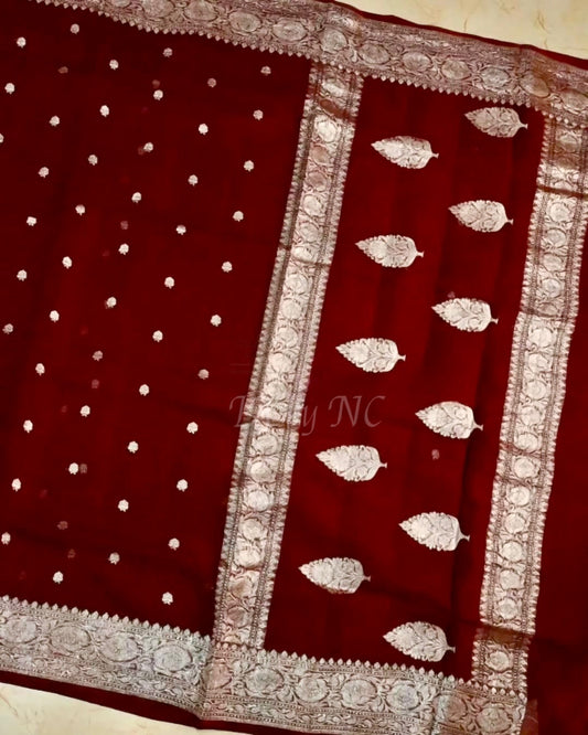 Presenting the Best Seller Khaddi Georgette of all time which defines the extreme artistic crafts of benarasi kadwa(locked) weaves in silver (Rupa) Zari.