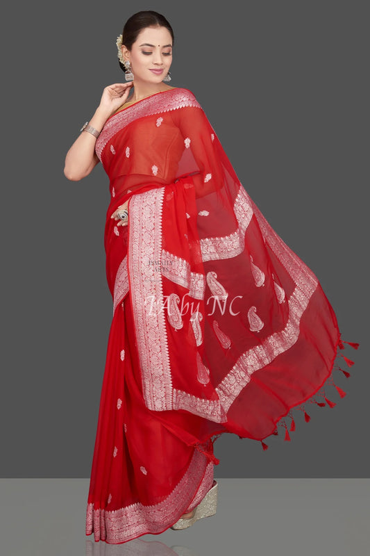 Scarlet Banarasi Pure Khaddi Georgette Kadwa Saree