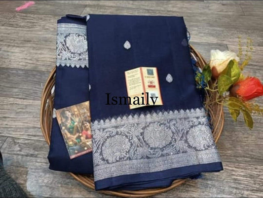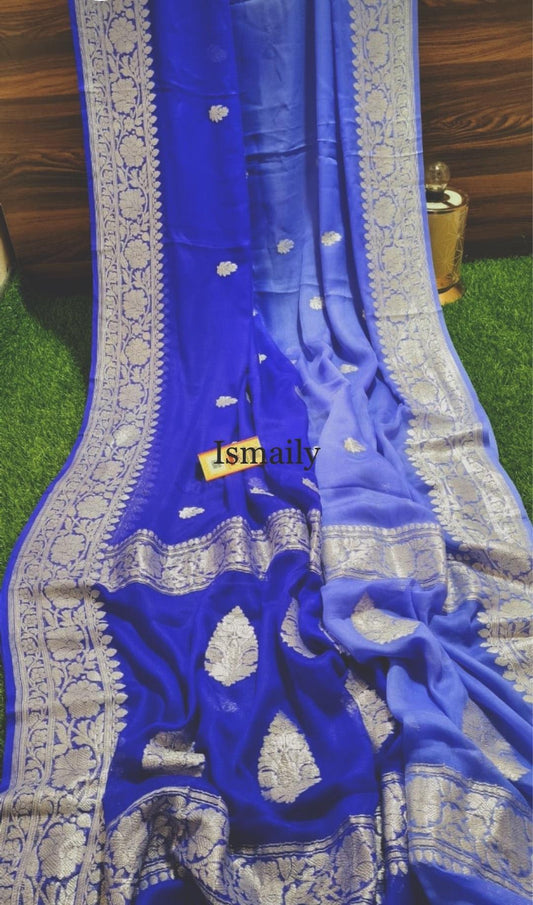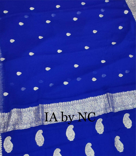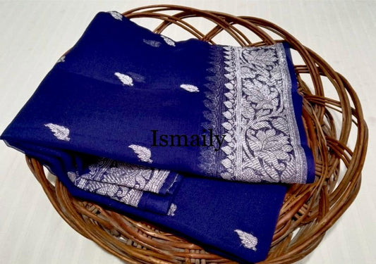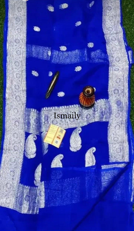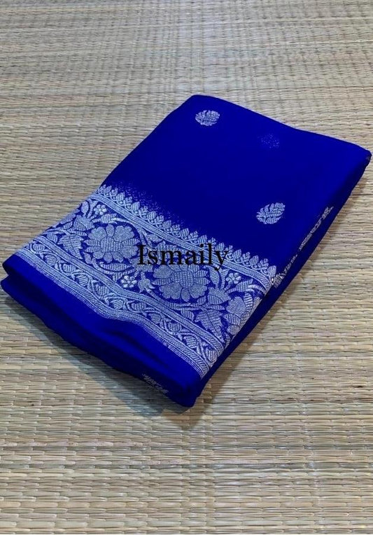 Presenting the Best Seller Khaddi Georgette of all time which defines the extreme artistic crafts of benarasi kadwa(locked) weaves in silver (Rupa) Zari.