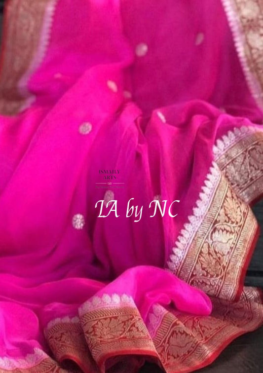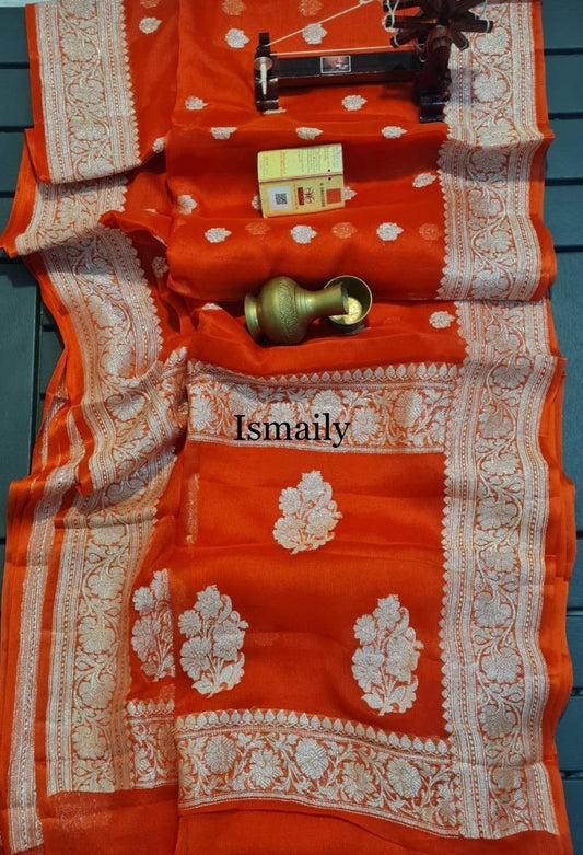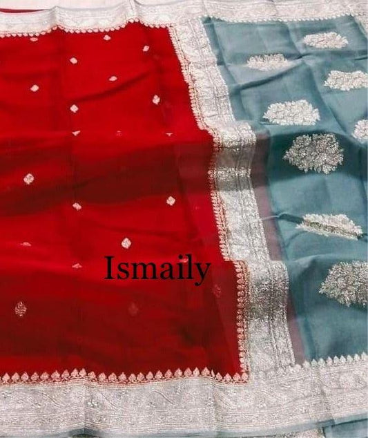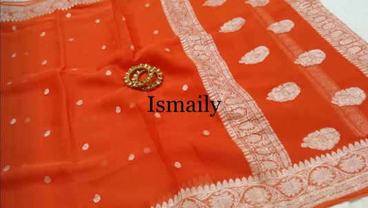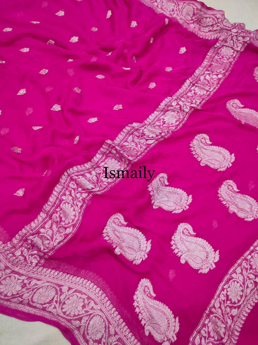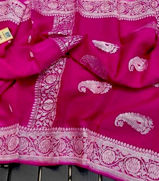 Presenting the Best Seller Khaddi Georgette of all time which defines the extreme artistic crafts of benarasi kadwa(locked) weaves in silver (Rupa) Zari.