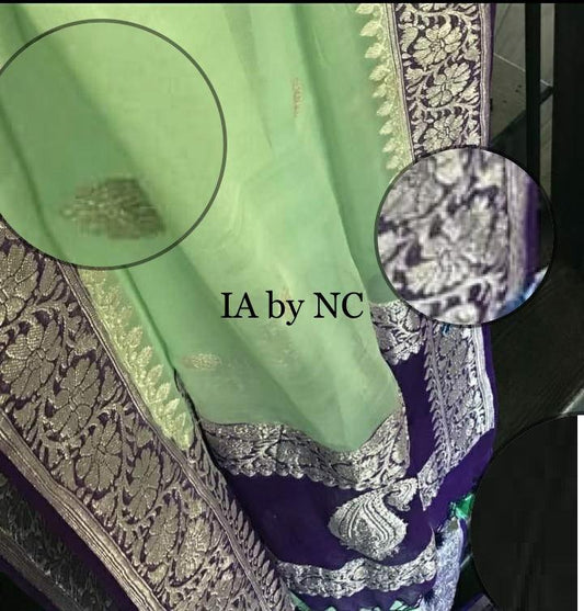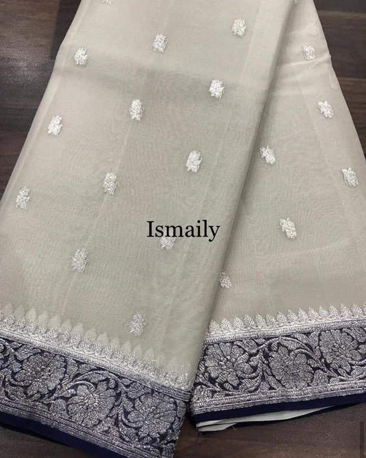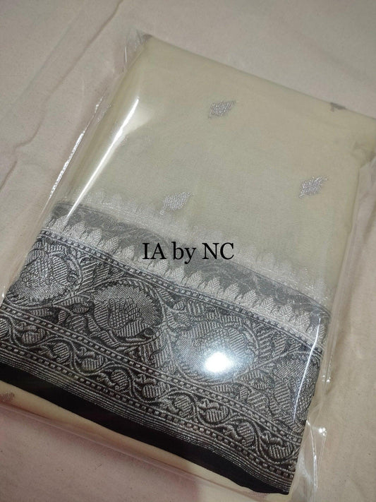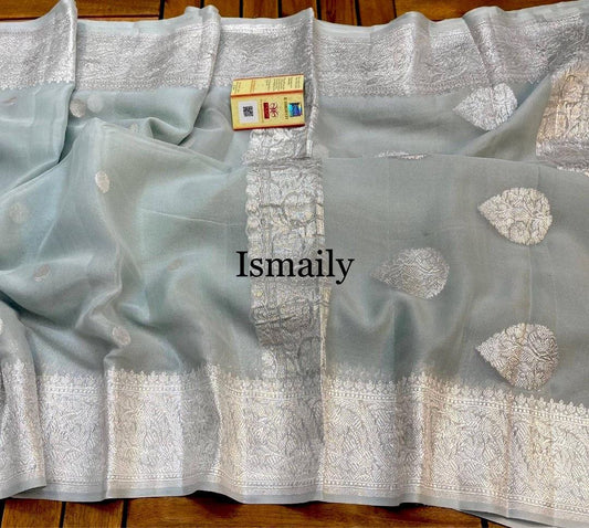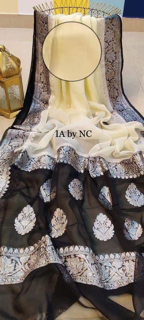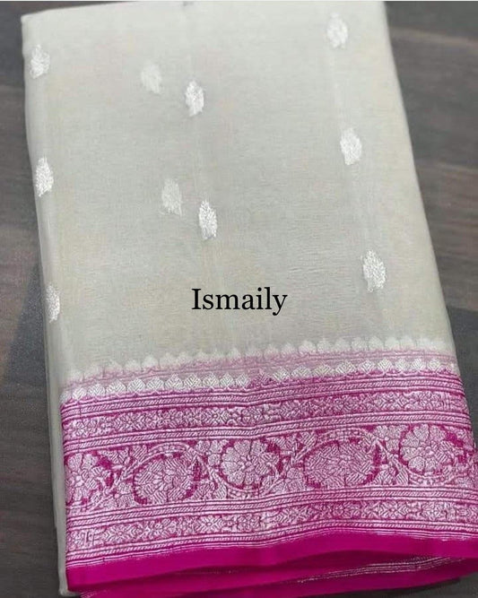 Presenting the Best Seller Khaddi Georgette of all time which defines the extreme artistic crafts of benarasi kadwa(locked) weaves in silver (Rupa) Zari.