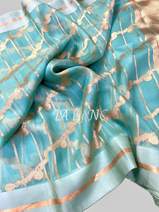 Turquoise Banarasi Pure Kora Organza Kadwa Saree