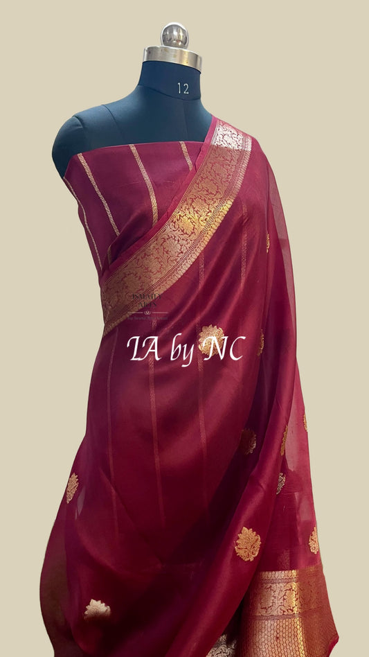 Carmine Banarasi Pure Kora Organza Kadwa Saree