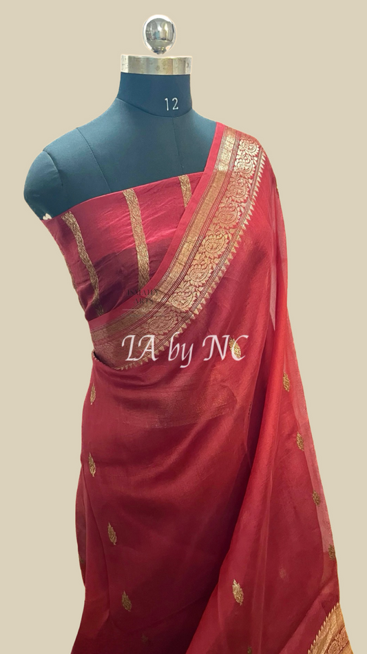 Carmine Banarasi Pure Kora Organza Kadwa Saree