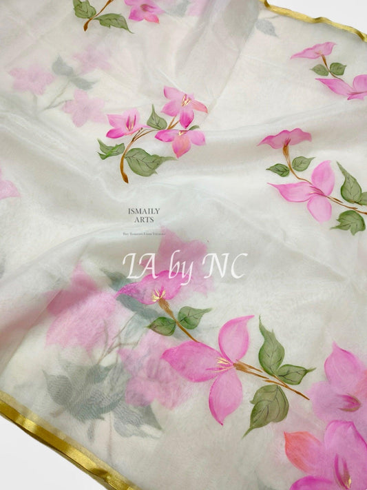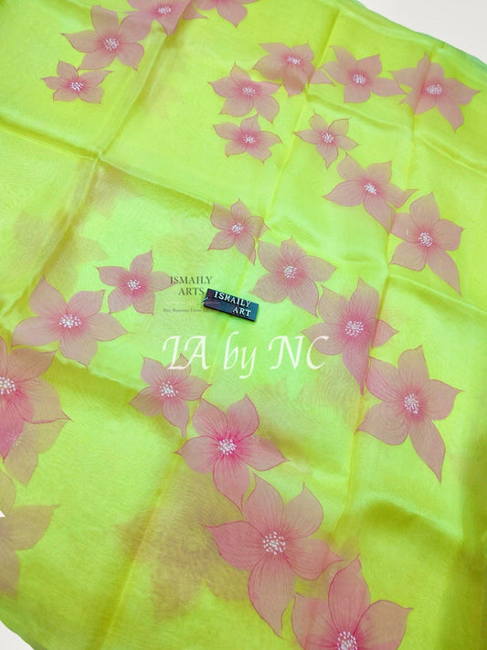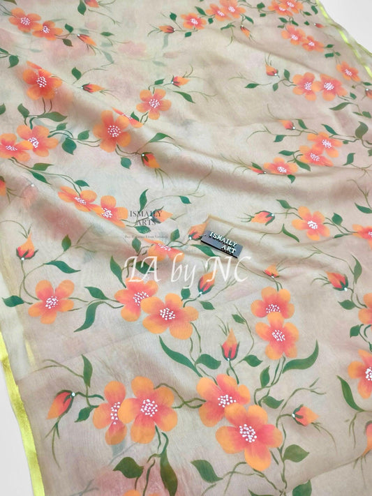Kora is a comfortable ,light weight and gossamer fabric woven using pure organza silk yarns. It is a thin sheer fabric made of a plain weave and the word Organza is derived from the word “Organzine” which denotes a material made from strong silk yarns that are twisted into strands.