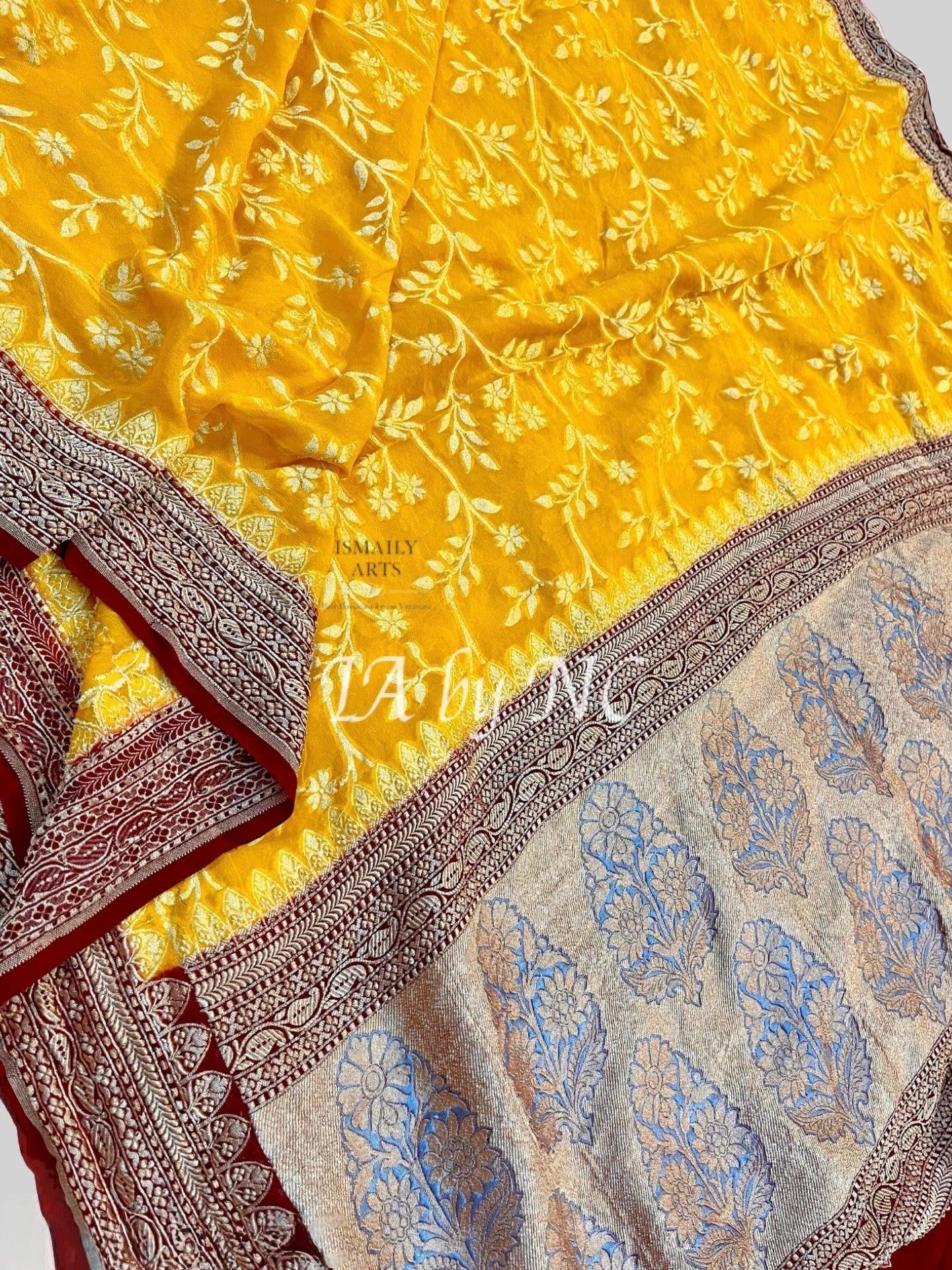 • Speciality - The glorious outline of kadua border lovingly handmade on a base of Georgette in gold zari motifs. Incredible in its details and a mirror to the splendour of Banaras.