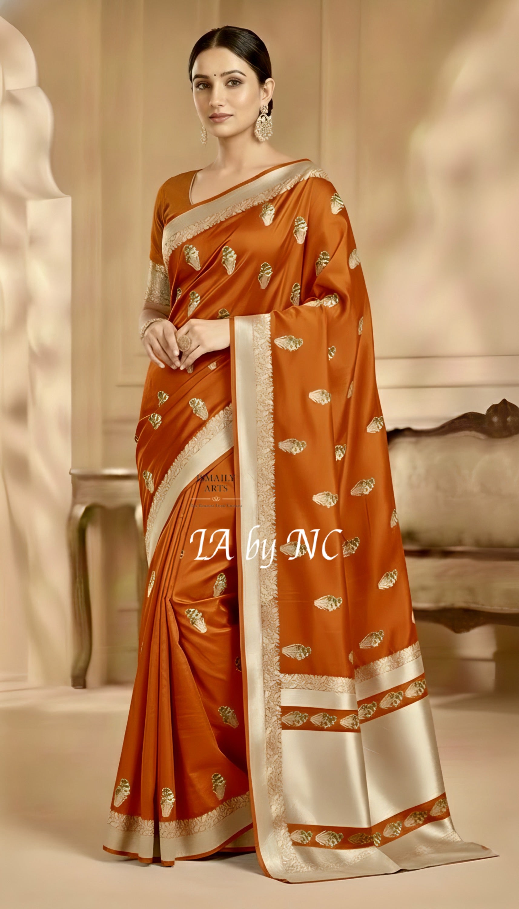 Ochre Banarasi Mashru Katan Silk Meenakari Saree