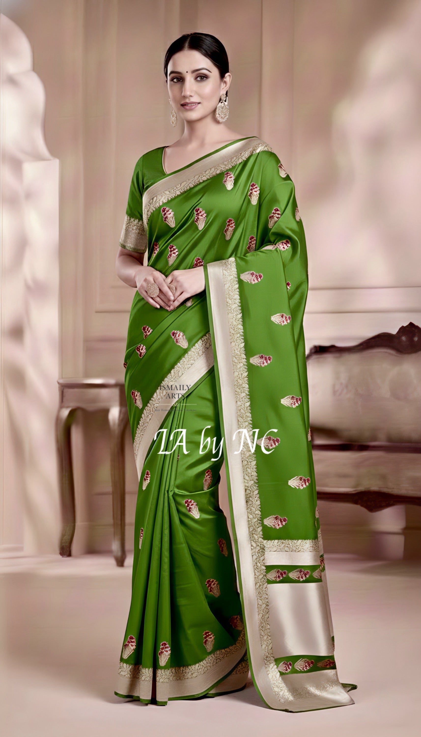 Avocado Banarasi Mashru Katan Silk Meenakari Saree