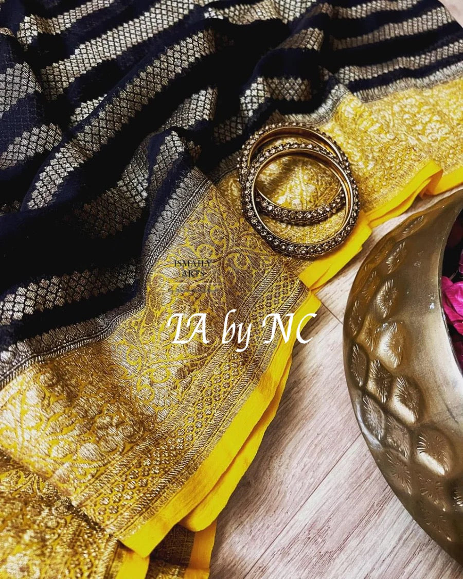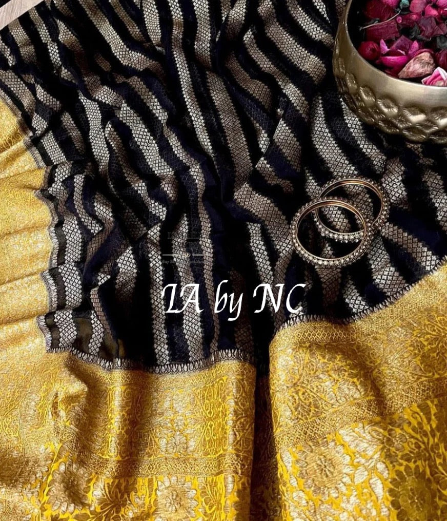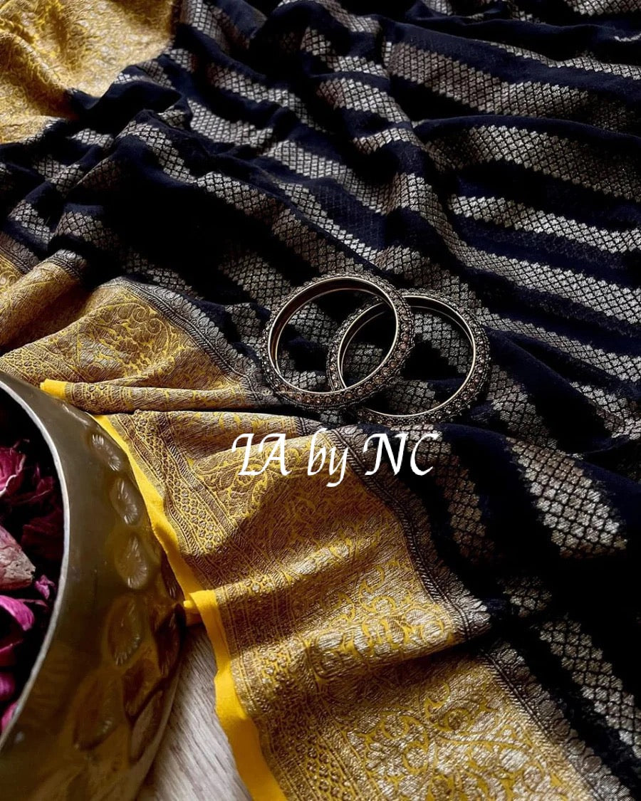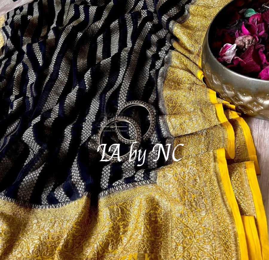 • Speciality - The glorious outline of kadua border lovingly handmade on a base of Georgette in Antique zari motifs. Incredible in its details and a mirror to the splendour of Banaras.