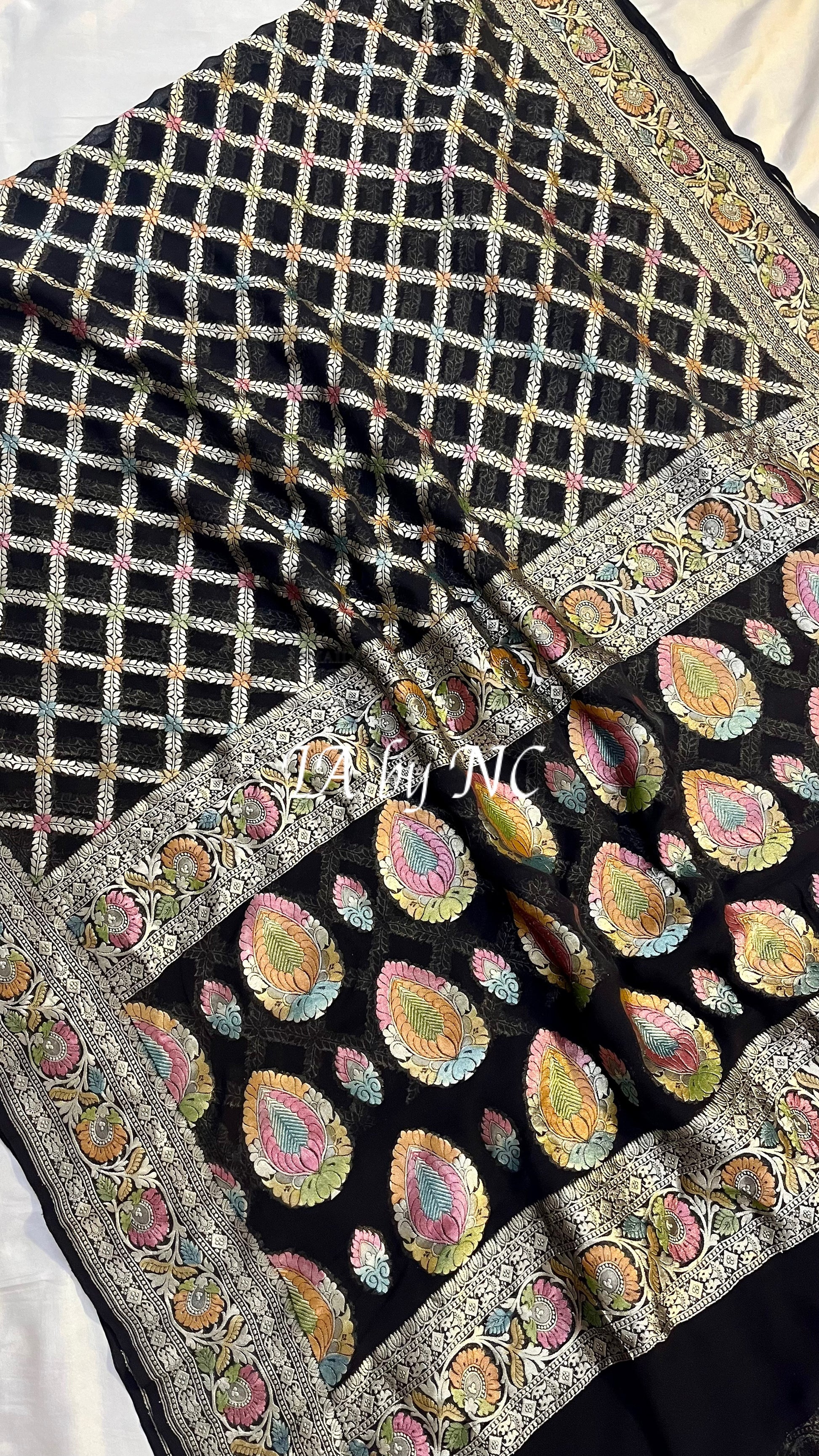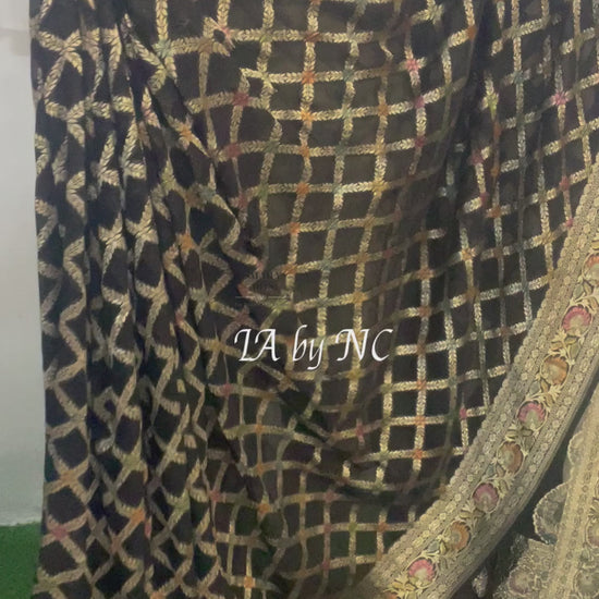 • Speciality - The glorious outline of kadua border lovingly handmade on a base of Georgette in Water zari motifs. Incredible in its details and a mirror to the splendour of Banaras.