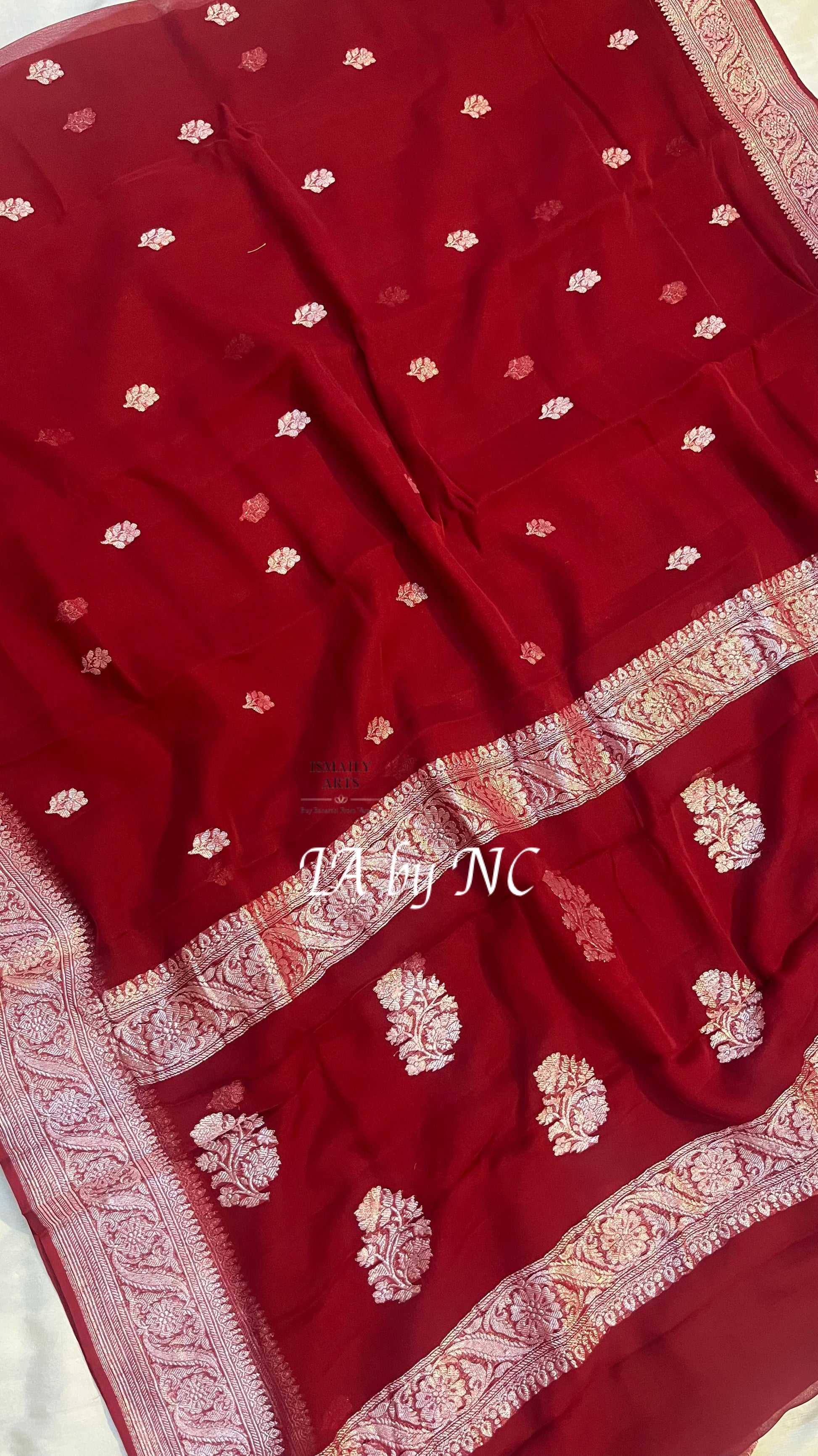 • Speciality - The glorious outline of kadua border lovingly handmade on a base of Georgette in Rupa(silver) zari motifs. Incredible in its details and a mirror to the splendour of Banaras.