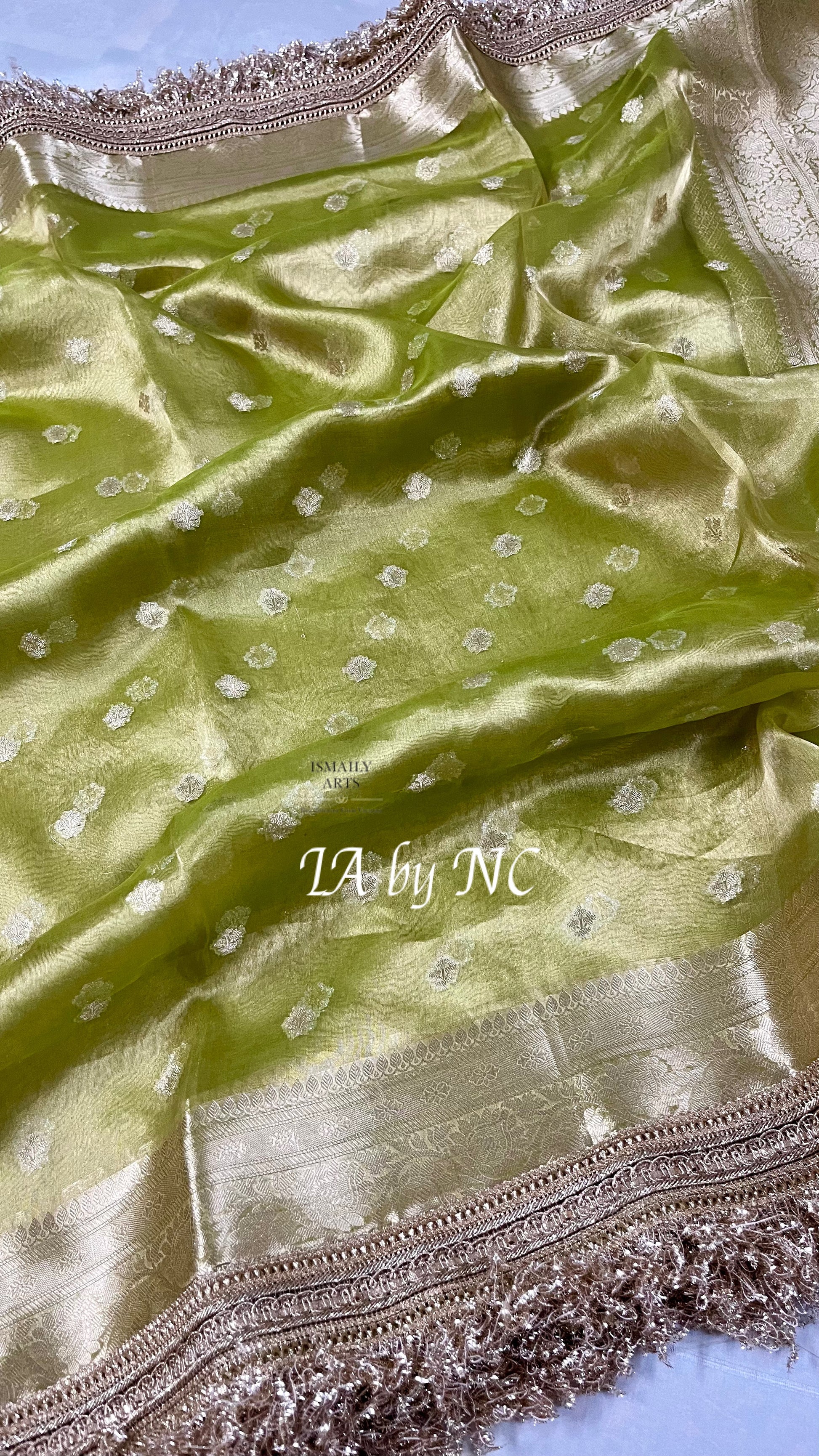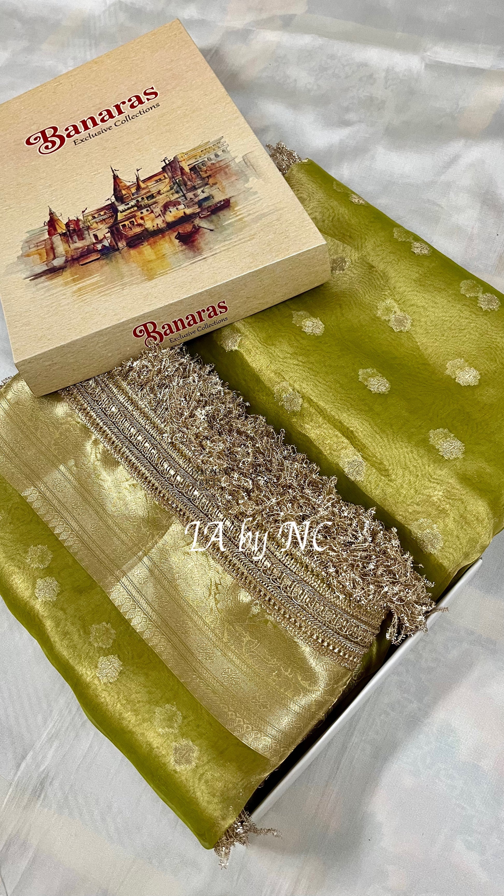 Speciality - The glorious outline of kadua border lovingly handmade on a base of Pure Kora Silk in Gold zari motifs. Incredible in its details and a mirror to the splendour of Banaras.