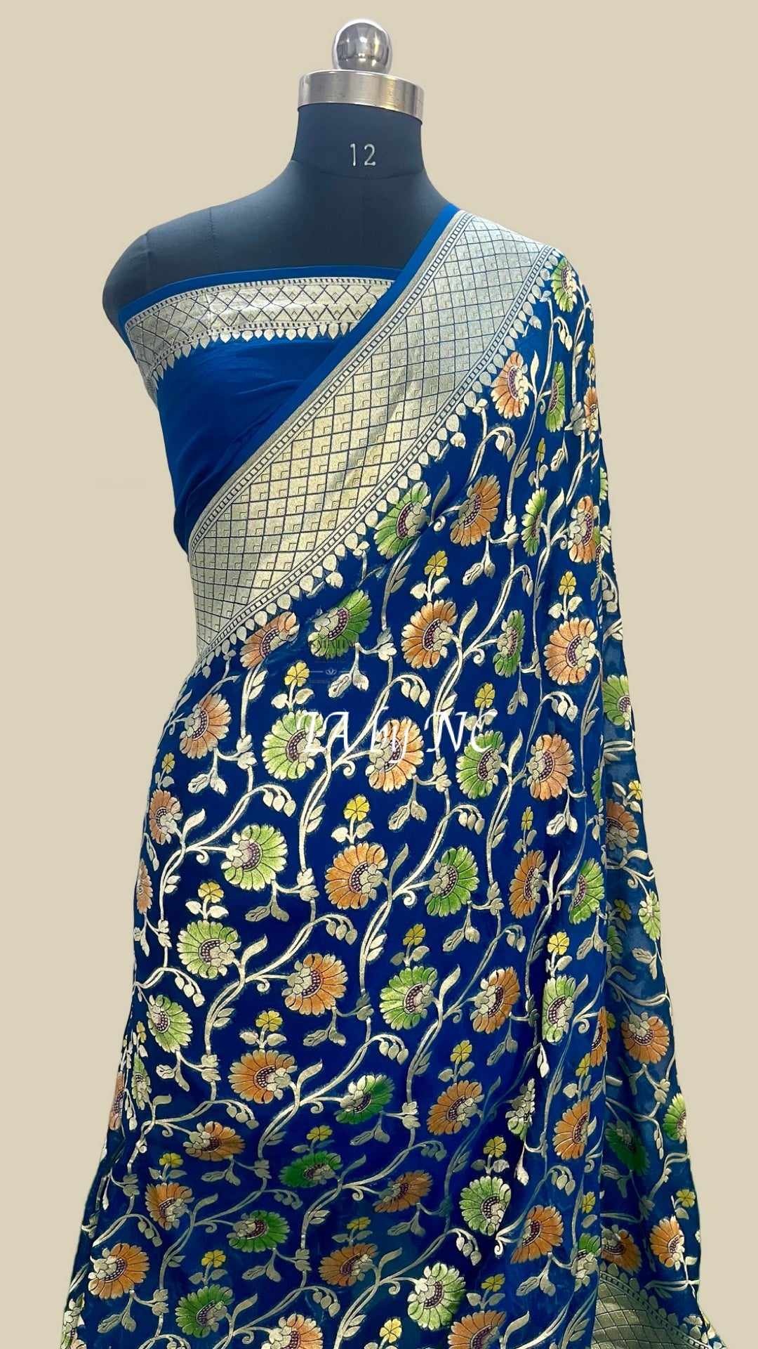 Speciality - The glorious outline of kadua border lovingly handmade on a base of Georgette in Water zari motifs. Incredible in its details and a mirror to the splendour of Banaras.