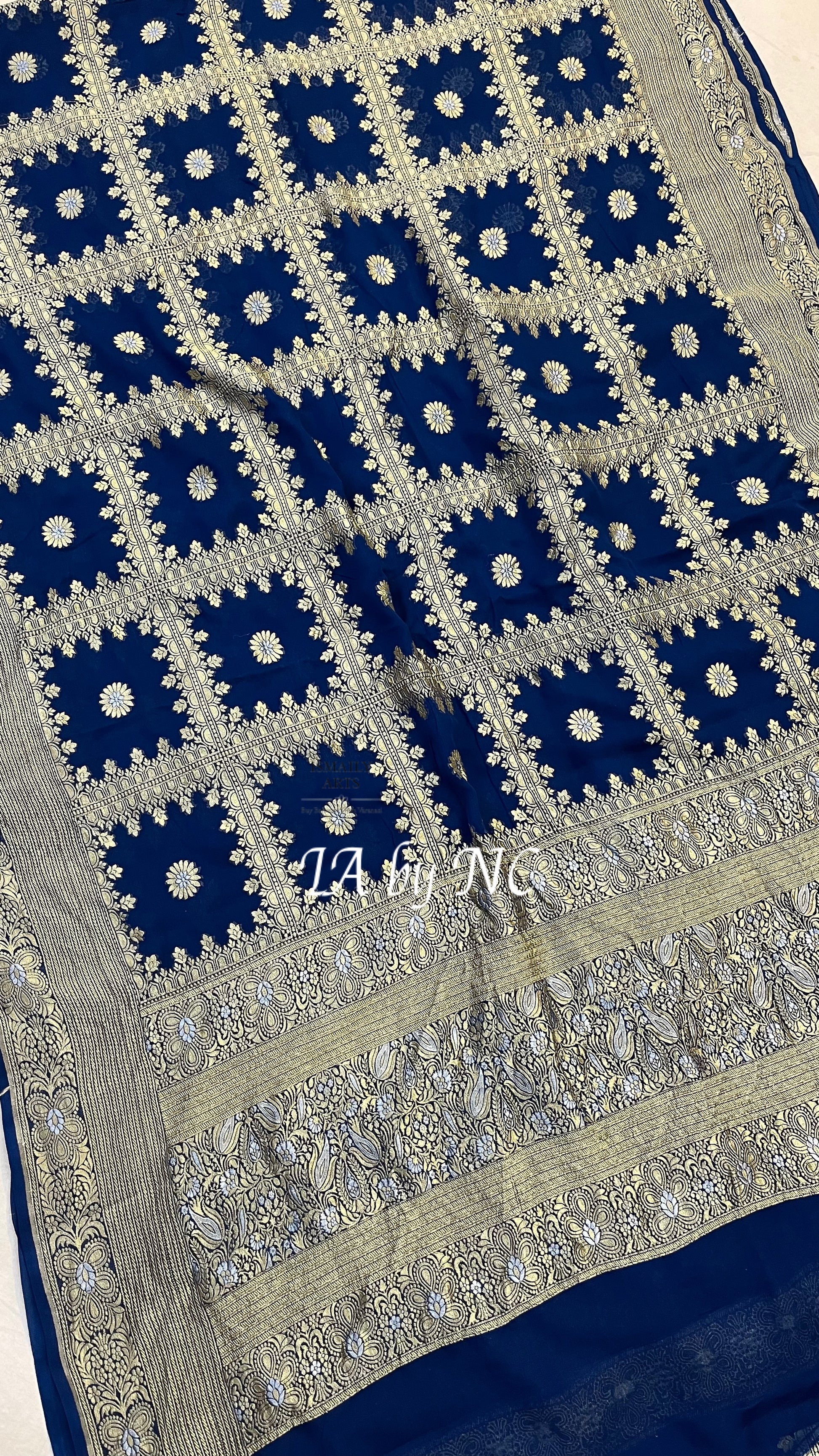 • Speciality - The glorious outline of kadua border lovingly handmade on a base of Georgette in Water and Silver zari motifs. Incredible in its details and a mirror to the splendour of Banaras.