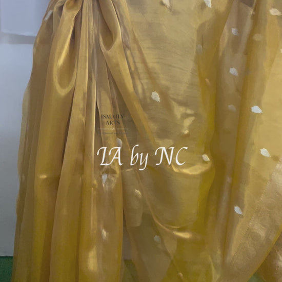 • Speciality - The glorious outline of kadua border lovingly handmade on a base of Pure Kora Silk in Gold zari motifs. Incredible in its details and a mirror to the splendour of Banaras.