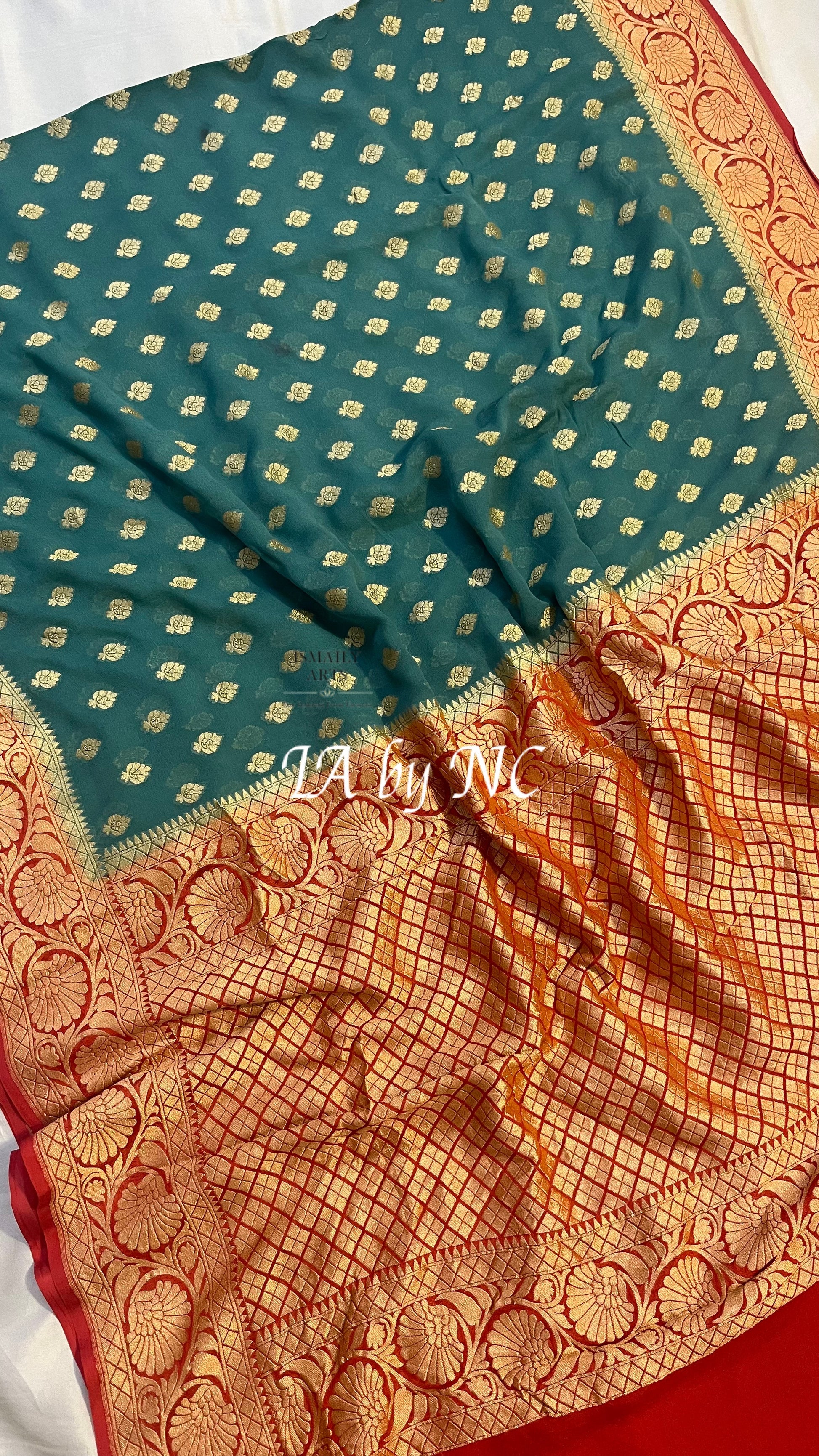 • Speciality - The glorious outline of kadua border lovingly handmade on a base of Georgette in gold zari motifs. Incredible in its details and a mirror to the splendour of Banaras.
